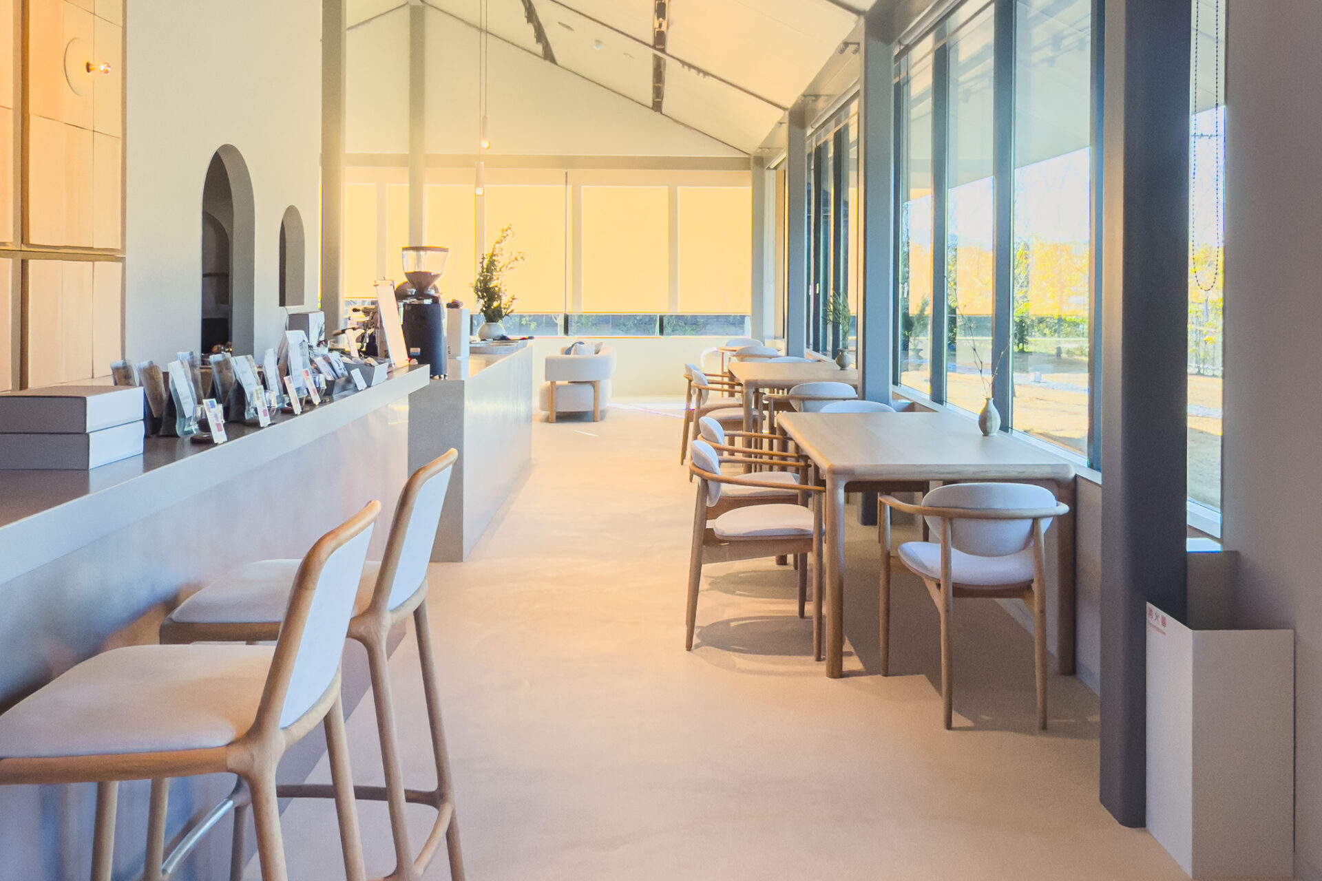 店内は、天井の高さが生む抜け感と、大きな窓から差し込むやわらかな光が印象的。